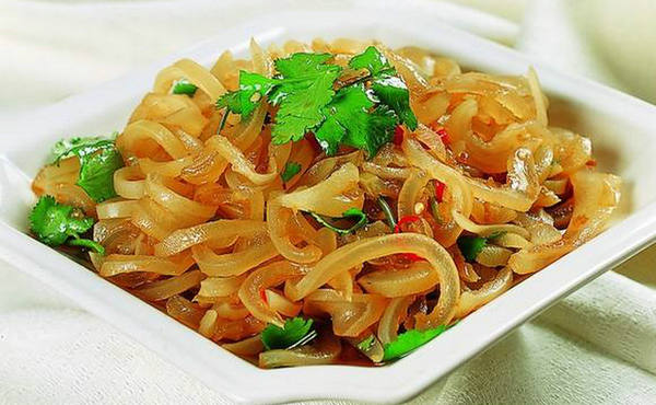 皮丝,是阜阳的特产,又称春祥皮丝,系新鲜猪皮经十多道工序加工而成,外观金黄途亮,薄如蝉翼,食之滑而不腻,味美绝伦。上等的皮丝经高级厨师烹调后,则成为招待客人的宴宾名菜,一般不可多得。阜阳皮丝