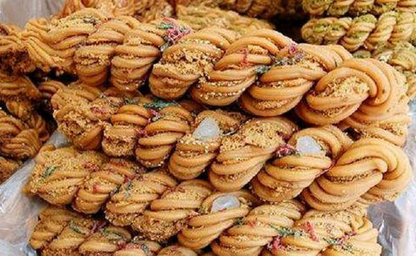 清朝末年,在天津卫海河西侧,繁华喧闹的小白楼南端,有一条名为“十八街”的巷子,有一个叫刘老八的人在这个巷子里开了一家小小的麻花铺,字号唤作“桂发祥”。这个人炸麻花有一手绝活,炸的麻花真材实料,选用精白面粉,上等清油。他的铺子总是顾客盈门。后来,他的生意越做越大,开了店面??蓟顾闶潜隹吐撬孀攀奔涞耐埔?,大家越来越觉得麻花有点乏而生腻,渐渐的生意就不如以往了。后来店里有个少掌柜的,一次出去游玩,回到家是又累又饿,就要点心吃,可巧点心没有了,只剩下一些点心渣。又没有别的什么吃的,那少掌柜的灵机一动,让人把点心渣与麻花面和在一起做成麻花下锅炸。结果炸出的麻花和以前的不一样,除了酥脆不艮和香气扑鼻,味道可口。按照这个方法,刘老八研究在麻花的白条和麻条之间夹进了什锦酥馅。桂花、闽姜、核桃仁、花生、芝麻.还有青红丝和冰糖。为了使自己的麻花与众不同,增强口感味道,把放置时间延长,取材也是愈来愈精细,如用杭州西湖桂花加工而成的精品咸桂花、岭甫种植甘蔗制成的冰糖、精制小麦粉等等。如今的“桂发祥”的招牌是由书法名家赵半知所题写。最终形成什锦夹馅大麻花,“桂发祥”麻花成为“天津三绝”之首。