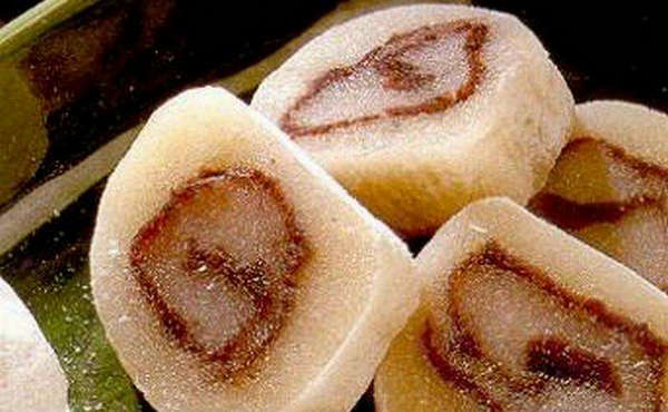 4、在案板上铺放洁白湿布一块,把熟糕粉倒上,用湿布包住,揿实。翻转过来,拍平至近6.7厘米厚(需上下四角方正光滑),揭去布用刀(蘸凉开水)切成长方形100块即成。