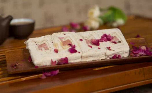 一块玫瑰酥糖最内为“酥心”,酥心外面是“屑子”,固定屑子的外层与隔层称之为“骨子”,他们的主要原料是:玫瑰花、白砂糖、芝麻、面粉。