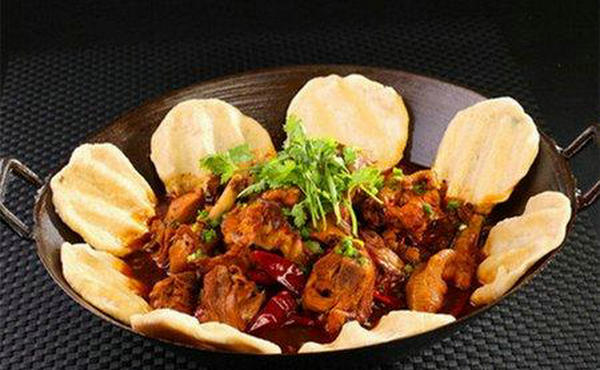 三、制作过程另锅放油烧热,爆香姜片、蒜仔、八角、花椒,倒入鸡块,烹入料酒,煸炒至水分将干时,添入高汤,加盖焖至汤汁浓稠、鸡块熟时,下入青红椒,调入精盐、味精、鸡精、鲜辣味粉、美极鲜酱油,稍后再下少许老抽调色并起锅盛入面饼锅中,随配酒精炉(或小土炉)上桌即成。