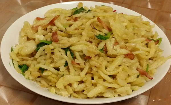 ①将土豆去皮,擦成丝,将土豆丝放在罩笠中,放在水龙头上冲水,不要把水控的太干,连水一起将土豆丝和蒸熟的大米倒入面粉中,使土豆丝和米饭挂水相对均匀(面与土豆丝以及米饭的体积的比例大约为1:1.5,边加土豆丝和大米边用手搅拌)。最终将所有土豆丝和大米都拌好,使每一根土豆丝和米粒都裹上面。