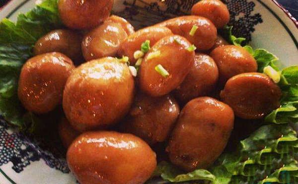 3、锅中油适量,炸煮好的土豆,等到表皮微皱的时候捞出来控干油份,待用。在这个时候内,另外拿一只锅,做卤水,把配料中所有调料通通放入。卤汁中放入炸好的土豆,大火烧开后,改小火煮20分钟至土豆软烂。鸡蛋是要剥皮后放的,10分钟后就要拿出来的。