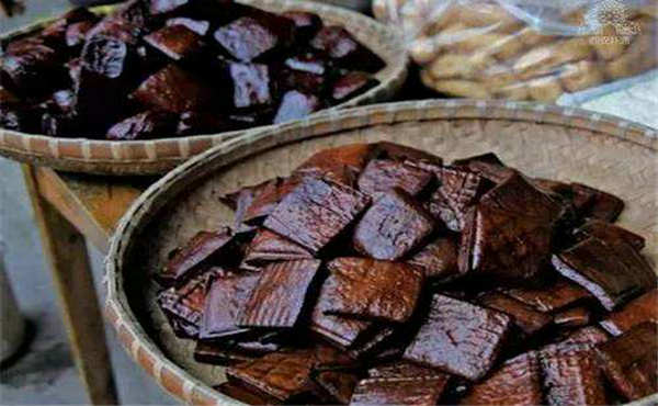 猪血豆腐干,外观虽不好看,却好吃,是安康市汉阴县的名食佳肴,也是中华豆腐干家族中的特有品种,相传始于明代晚期,快400岁了。它不仅是民间食品,历史上还是供皇帝食用的贡品,现在己走进了星级宾馆饭店,成了宴请嘉宾的地方风味名馐之一。